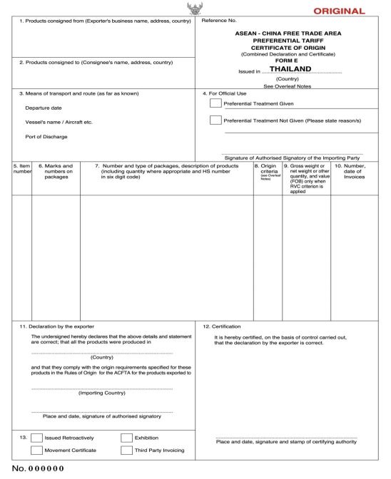 Form E คือ หนังสือรับรองถิ่นกำเนิดสินค้า โดยการระบุสัญชาติของสินค้าว่ามีการผลิต และส่งออกจากสมาชิกประเทศภายใต้เขตการค้าเสรีอาเซียน – จีน โดยมีทั้งหมด 11 ประเทศ คือ จีน ไทย สิงคโปร์ ฟิลิปปินส์ เมียนมาร์ มาเลเซีย อินโดนีเซีย ลาว กัมพูชา เวียดนาม และบรูไน ในส่วนของ เขตการค้าเสรีอาเซียน – จีนเป็นการรวมกลุ่มกันทำข้อตกลงเพื่อขยายการค้าสิทธิพิเศษทางภาษีศุลกากร ที่สามารถลดหย่อนภาษีนำเข้าสินค้าบางประเภท จากประเทศสมาชิกได้